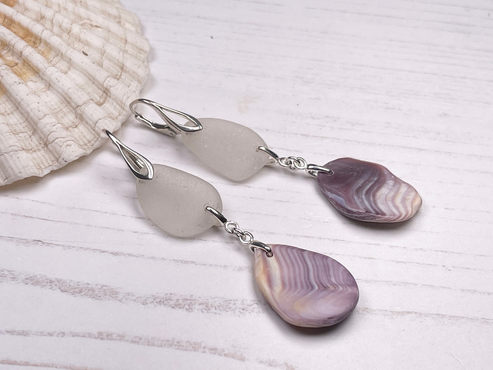 Scottish white sea glass paired with North American quahog shell, also called wampum on sterling silver earrings. Gorgeous dangling earrings in white and purple. These are lever back earrings.