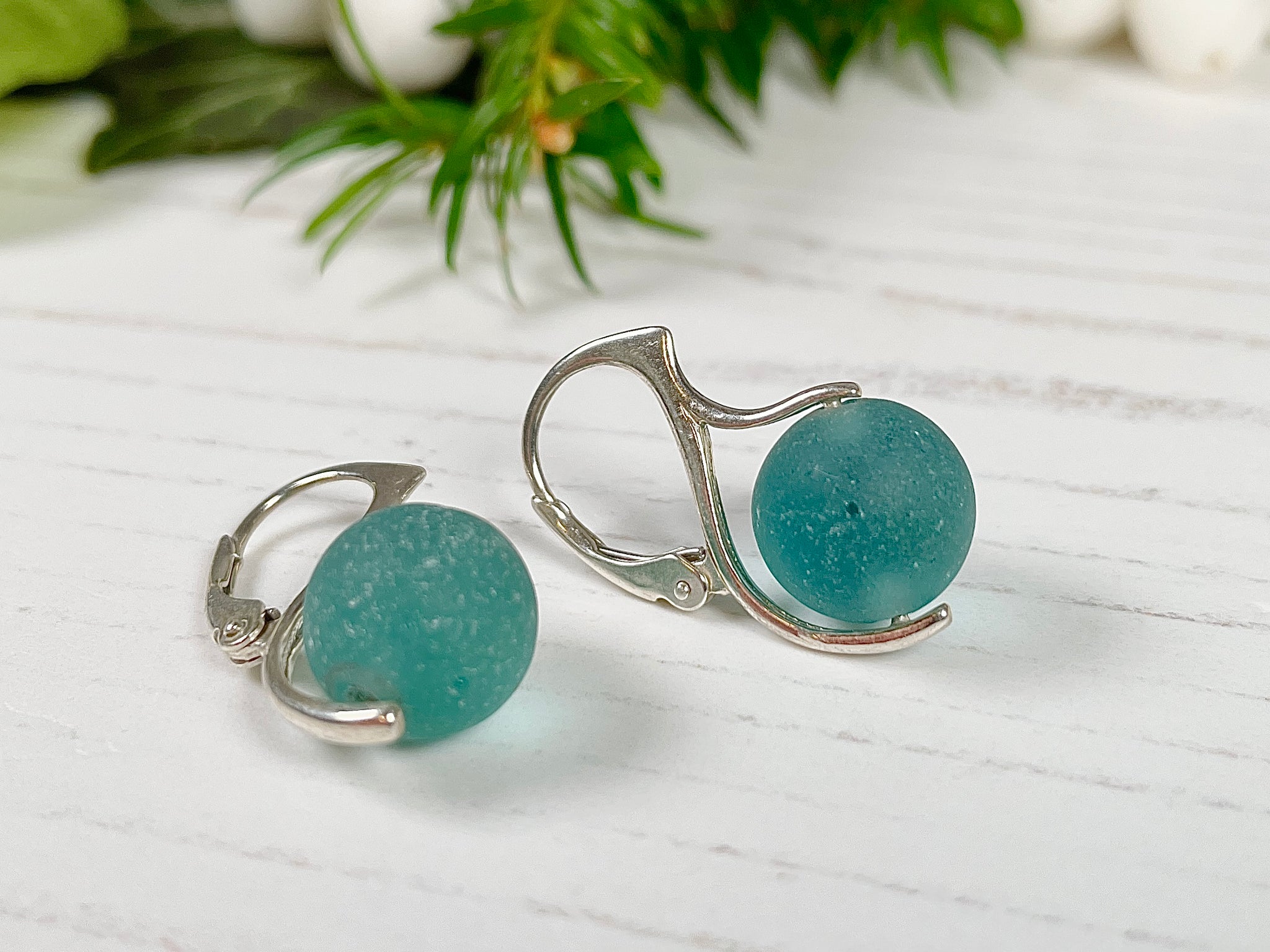 Japanese Dark Aqua Sea Glass Marble Earrings, Leverback Sterling Silver