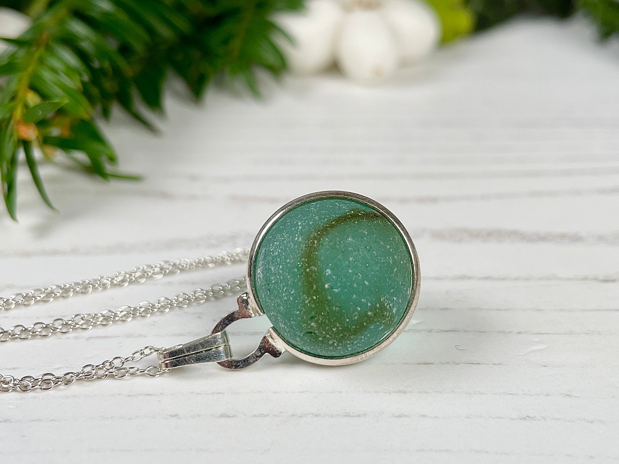 Japanese Sea Glass Marble Necklace in lovely Oceanic shade of teal with a swirl! Beach found Japan sea glass from the Tokyo Bay area.