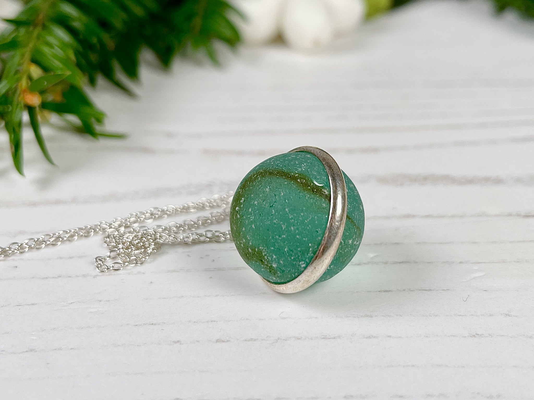 Japanese Sea Glass Marble Necklace, Teal Beach Glass, Sphere Pendant