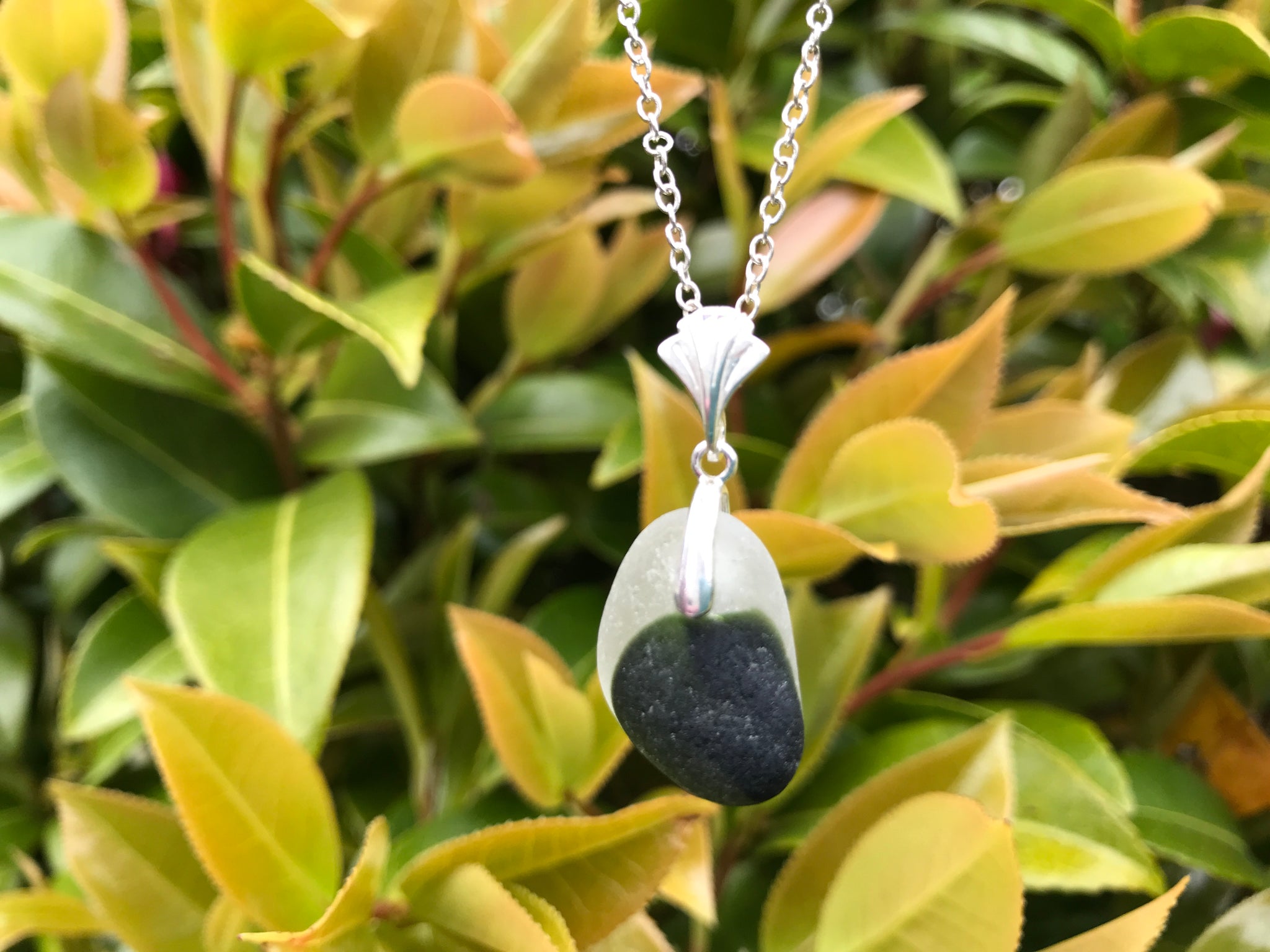 Wonderful piece of Seaham sea glass in lovely shades of green with unique stripes on a sterling silver. There are multiple layers in this piece, hard to capture!