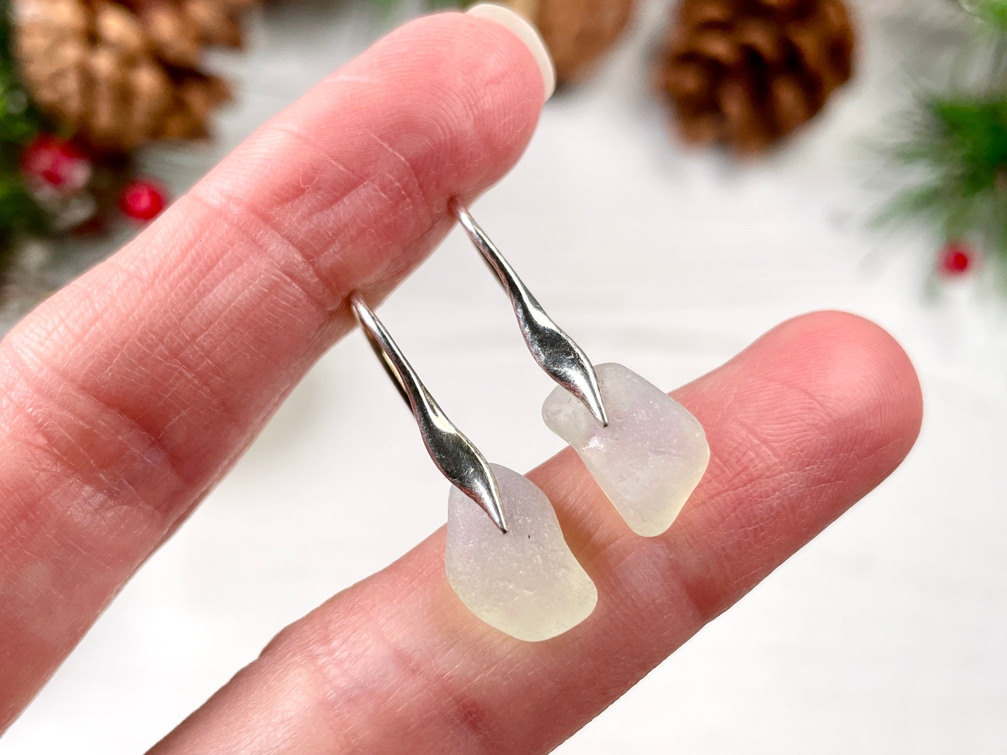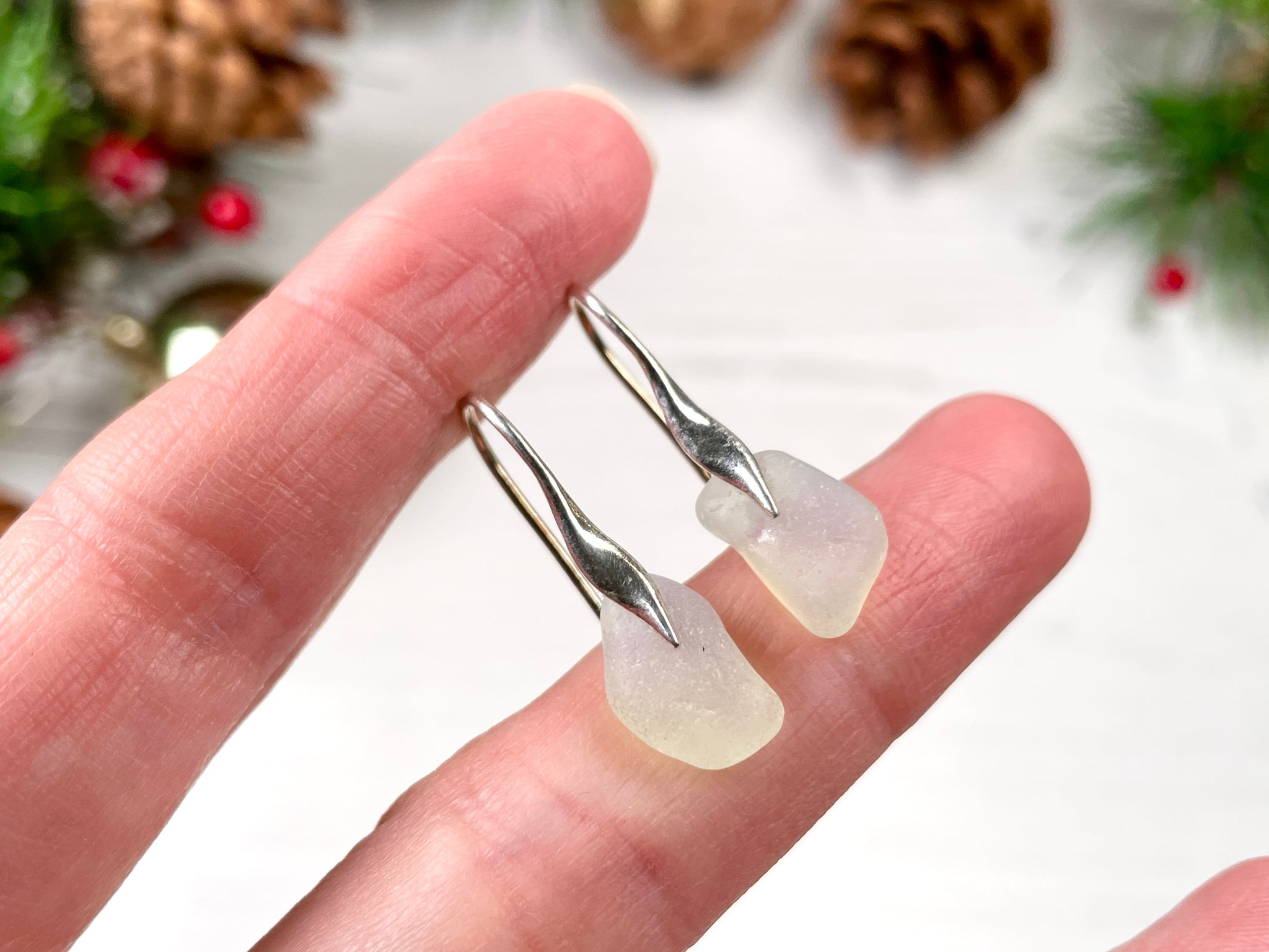 Wave design earrings with Opalescent sea glass from Seaham. Opalescent sea glass has s subtle blue shimmer with a yellow hint - the colour of the sea glass changes with the light! It is best visible when wet or ever so slightly oiled with unscented baby oil. The sea glass is sheer and will let light through, which makes the earrings glow. These earrings are more opaque.